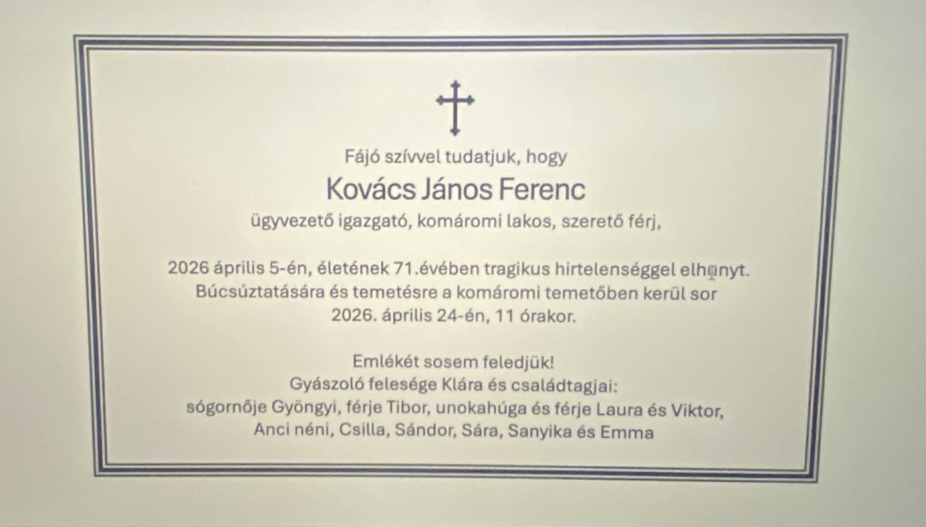Elhunyt Kovács János Ferenc